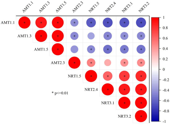 Correlation coefficients between the expression levels of AMT family genes and NRT family genes of Pinus massoniana seedlings. Note: Pearson correlation coefficients r were determined across all nitrogen treatments and inoculation treatments. * p < 0.01 (Bonferroni correction).
