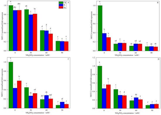The relative expression of the NRT family genes of Pinus massoniana seedlings as a function of NO3− solution concentration (A, B, C and D). Note: Vertical bars illustrate standard errors of means (n = 3). Differences in treatments were analyzed with the Kruskal-Wallis rank sum test. Significant tests (p < 0.05) were followed by Duncan’s test of multiple comparisons, significant differences are indicated by lowercase letters.CK: control. Sg: Suillus grevillei. Pt: Pisolithus tinctorius. N0: 0 kg·N·ha−1a−1. N30: normal deposition of 30 kg·N·ha−1a−1. N60: moderate deposition of 60 kg·N·ha−1a−1. N90: severe deposition of 90 kg·N·ha−1a−1.