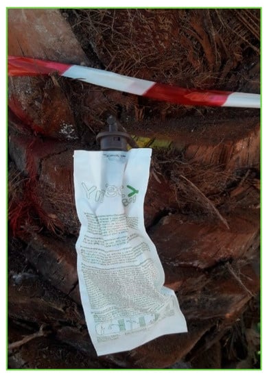 - Conti, F.R.; Cerrella, D.C. Monitoring red palm weevil, Rhynchophorus ferrugineus Olivier, with pheromone traps: Five years of experience in Sicily. In Colloque Méditerranéen sur les Ravageurs des Palmiers, Nice, France, 16–18 January 2013; Association Française de Protection des Plantes (AFPP): Alfortville, France, 2013; pp. 1–7. [Google Scholar]