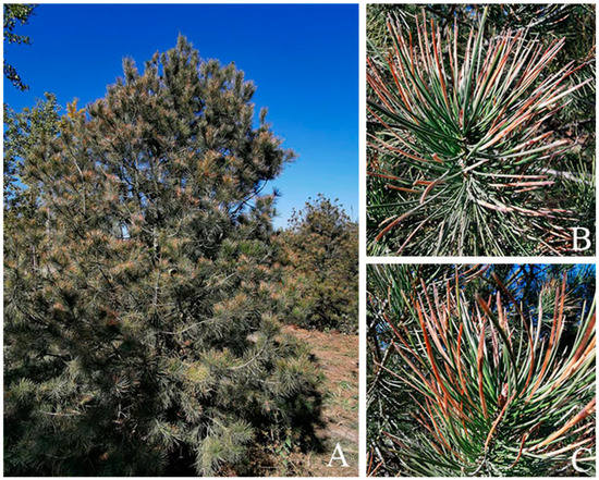 Symptoms of infection by A. alternata on P. bungeana in the field. (A), Withered tips of the whole tree. (B,C), Magnified image showing symptoms on needles.