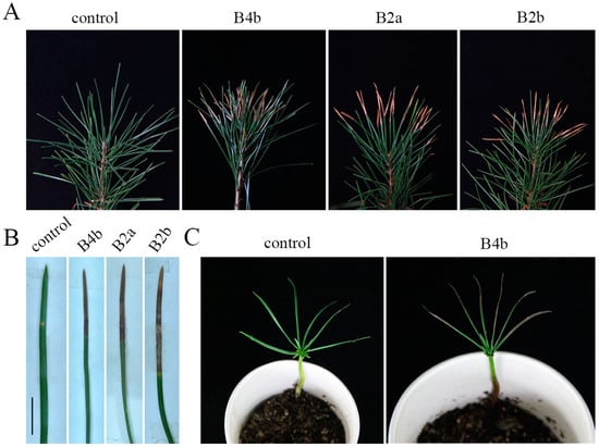 Re-isolations were performed from the margins of needles inoculated with ten isolates, and morphological and phylogenetic comparisons were conducted to meet Koch’s postulates.
