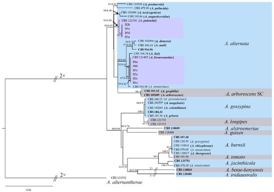 The reference sequences of 43 Alternaria spp. described by Woudenberg et al. [20] selected for the phylogenetic analyses are also listed in Table 2 together with their corresponding GenBank accession numbers. Sequences in Table 2 were retrieved from the GenBank database (https://www.ncbi.nlm.nih.gov/ (accessed on 10 February 2021)). A. alternantherae (CBS 124392) was used as the outgroup. The alignments of nucleotide sequences were obtained by using Clustal W in BioEdit software [45]. Treating gaps in the alignment as a fifth character, all of the characters had equal weight [46].