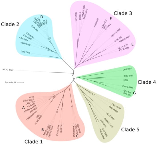 - Gounot, J.S.; Neuveglise, C.; Freel, K.C.; Devillers, H.; Piskur, J.; Friedrich, A.; Schacherer, J. High Complexity and Degree of Genetic Variation in Brettanomyces bruxellensis Population. Genome Biol. Evol. 2020, 12, 795–807. [Google Scholar] [CrossRef]