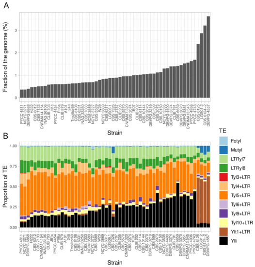 - Bleykasten-Grosshans, C.; Neuveglise, C. Transposable elements in yeasts. Comptes Rendus Biol. 2011, 334, 679–686. [Google Scholar] [CrossRef] [PubMed]