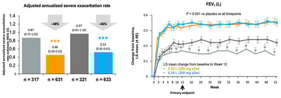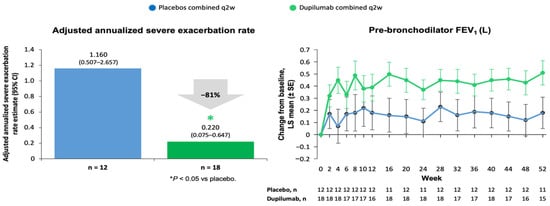 Recently, data have emerged from clinical trials and real-world effectiveness studies of dupilumab that supports its potential in treating ABPA based on a subset of severe asthma patients selected for pivotal trial inclusion on phenotypic characteristics [,]. As seen in analyses of omalizumab effectiveness in asthma, dupilumab’s clinical benefit is greater in subjects with more pronounced T2 biomarkers (FENO, eosinophils) compared with asthmatics lacking a T2 biomarker signature or more modest elevations in these biomarkers [,]. A post hoc analysis of data collected in one of the pivotal phase 3 trials of dupilumab (Liberty Asthma Quest) [] compared subjects meeting serologic criteria for ABPA (total IgE > 1000 IU/mL, Aspergillus-specific IgE > 0.35 IU/mL, eosinophils > 500) receiving dupilumab (n = 18) to those receiving a placebo (n = 12) []. Baseline characteristics were well matched. Dupilumab significantly reduced severe asthma exacerbations and improved lung function in the seropositive ABPA group on the drug compared to the placebo, and also to a greater degree than in the large sample of non-ABPA asthmatics in the trial (Figure 4), while also significantly reducing total and Aspergillus-specific IgE levels, FENO and CCL17/TARC levels []. However, the highest quality evidence rests upon randomized placebo-controlled trials designed to specifically address the question of efficacy and safety in a well-defined target population sample, leading to a licensing label expansion. Fortunately, such a trial has been initiated for the use of dupilumab in subjects with asthma and ABPA (https://clinicaltrials.gov/ct2/show/NCT04442269, URL accessed on 4 December 2022; Regeneron-Sanofi).