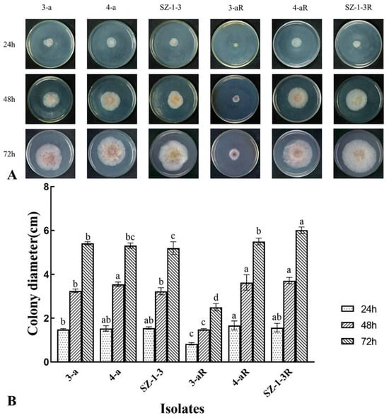 Figure 1. Mycelial growth of three prothioconazole-resistant mutants of F. graminearum. The top panel (A) shows the colony growth of both the resistant mutants (R) and their wild-type parental isolates on PDA after 24, 48, and 72 h incubation on PDA at 24 °C, while the graphs below (B) show the average colony diameter. Data represent the means of eight replicates ± standard error (SE). Different letters above columns indicate significant differences according to Fisher’s least-significant difference test (p ≤ 0.05).