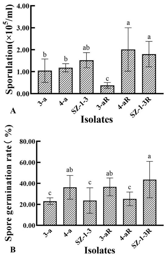 Figure 2. Sporulation and germination rates of three prothioconazole-resistant mutants of F. graminearum. The sporulation (A) of the three resistant mutants (R) and their wild-type parental isolates was assessed after incubation in mung bean broth at 24 °C with shaking (130 rpm) for 3 days, while the germination rate (B) was assessed on PDA after 24 h at 24 °C. Data represent the means of six replicates ± standard error (SE). Different letters above columns indicate significant differences according to Fisher’s least-significant difference test (p ≤ 0.05).