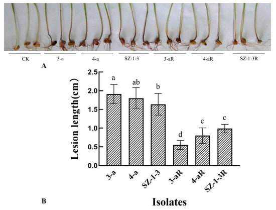 Figure 3. Disease symptoms and pathogenicity of three prothioconazole-resistant mutants of F. graminearum. Disease symptoms (A) caused by three prothioconazole-resistant mutants (R) were compared to those of their wild-type parental isolates at 14 days postinoculation (dpi), and the pathogenicity quantified based on the lesion length (B). Data represents the means of 10 wheat coleoptiles, and two independent experiments. Bars indicate one standard error (SE), while different letters above the columns indicate significant differences according to Fisher’s least-significant difference test (p ≤ 0.05).