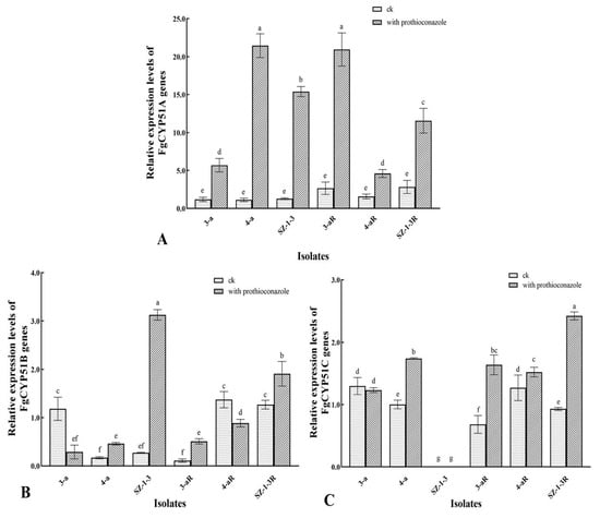 Figure 4. Relative expression of three FpCYP51 genes in prothioconazole-resistant mutants of F. graminearum. The relative expression of three FpCYP51 genes, including FgCYP51A (A), FgCYP51B (B), and FgCYP51C (C), was compared in both the resistant mutants (R) and their wild-type parental isolates, as well as in the absence and presence of prothioconazole (0.1 μg/mL), with β-tubulin as the reference gene. Different letters above the columns indicate significant differences according to Fisher’s least-significant difference test (p ≤ 0.05). Bars indicate one standard error (SE).