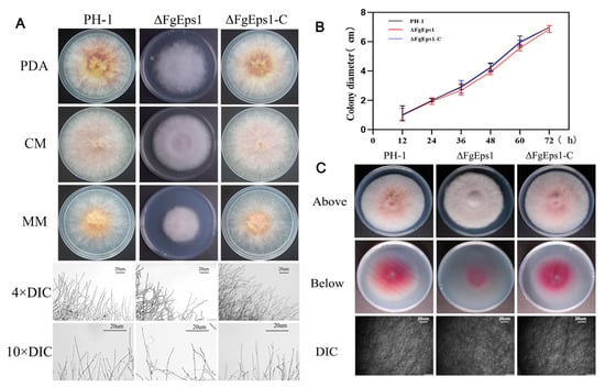 To investigate the role of FgEps1 in the nutritional growth and penetration ability of F. graminearum, we inoculated wild-type strain PH-1, deletion mutant strain ΔFgEps1, and complemented strain ΔFgEps1-C on PDA, CM, and MM agar medium at 25 °C for 3 days, respectively. It was found that deletion of FgEps1 did not affect the nutritional growth of the strain compared to the wild-type strain PH-1 and complemented strain ΔFgEps1-C. However, the deletion of FgEps1 did cause the marginal mycelium to become denser and more curled, and the divergence angle at the end of the mycelia became smaller (Figure 1A). The growth rates of the different strains are shown in Figure 1B. To simulate the penetration of the ΔFgEps1 strain into the host plants, we inoculated the activated wild-type strain PH-1, deletion mutant ΔFgEps1, and complemented strain ΔFgEps1-C in the center of PDA medium lined with sterile cellophane and incubated them at 25 °C for 3 days. It was found that the mycelium of the ΔFgEps1 strain was much denser and produced less pigment than the other strains. The absence of FgEps1 was observed to have a reduced penetration ability of F. graminearum mycelium to some extent on the uncovered cellophane (Figure 1C). In summary, these results suggest that FgEps1 is involved in the mycelial morphology or phenotype of F. graminearum.