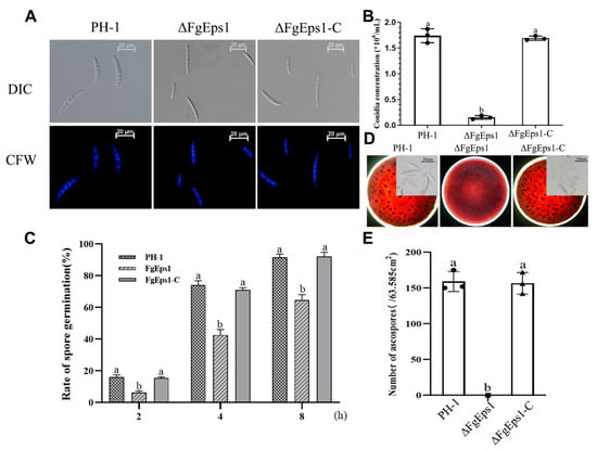 Figure 2. Effects of FgEps1 deletion on asexual and sexual reproduction in F. graminearum. (A) Conidial morphology produced by 3 days incubation in CMC liquid medium is shown. (B) Conidia productions by F. graminearum strain PH-1, ∆FgEps1, and ∆FgEps1-C were measured by counting the number of conidia produced in 3-day-old CMC cultures. Bars denote standard deviations from three repeated experiments. (C) Conidia of all strains were incubated in YEPD liquid medium at 25 °C for 2, 4, and 8 h, and then 100 spores were examined for spore germination. (D) Sexual reproduction status of each strain on carrot agar medium and morphology of ascospores after dissection of sexual ascospore shells (bar = 100 μm). (E) The unit area of ascospores produced by each strain on each 9 cm × 9 cm carrot agar medium is shown. Each experiment was repeated three times. The same letter on the bars for each treatment represents no significant difference at p < 0.05.