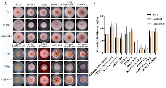 Figure 3. Sensitivity of ΔFgEps1 to different stress factors. (A) Growth phenotypes of WT PH-1, ∆FgEps1 mutant, and ∆FgEps1-C complement in PDA medium with 0.25 ppm cyhalothrin, 0.2 g/L Congo red, 0.02% SDS, 1 M KCl, 1 M NaCl, 0.2 M MgCl2·6H2O, 0.5 M CaCl2, 0.75 g/L caffeine, 15 mM H2O2, CuSO4·5H2O, and 0.25 ppm tebuconazole, respectively, and cultured at 25 °C for 3 days. (B) Statistical analysis of the growth inhibition rate of the strains to the above-mentioned stressors is provided. Each experiment was repeated three times. The same letter on the bars for each treatment represents no significant difference at p < 0.05.