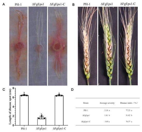 Figure 4. Effect of FgEps1 deficiency on the pathogenicity of F. graminearum. (A) The infection status of maize silk inoculated with strain PH-1, ∆FgEps1, and ∆FgEps1-C is displayed. Each experiment was repeated three times. (B) Disease 15 days after inoculation of flowering wheat heads with conidial suspensions of PH-1, ∆FgEps1, and ∆FgEps1-C is shown. (C) Infection length of maize silk inoculated with strain PH-1, ∆FgEps1, and ∆FgEps1-C is presented. (D) Disease index and mean severity of wheat heads inoculated with strain PH-1, ∆FgEps1, and ∆FgEps1-C are shown. Means and standard deviations were calculated from three independent experiments. Values followed by the same letter are not significantly different (p < 0.05).