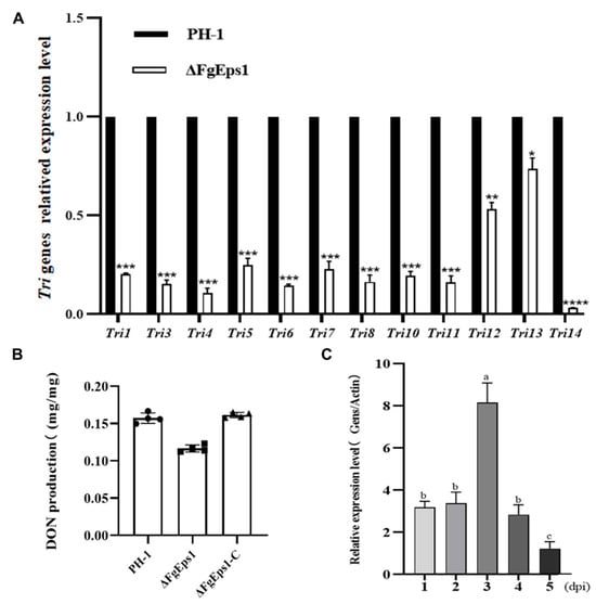 Figure 5. Expression levels of FgEps1 during the period of F. graminearum infection and the effect on Tri gene clusters and DON toxin synthesis after deletion. (A) The relative transcription levels of 12 Tri genes in WT PH-1 and ∆FgEps1 are shown. For each gene, the expression level in PH-1 was normalized to 1. Bars denote standard deviations from three repeated experiments. Significant differences compared with PH-1: * p < 0.05, ** p < 0.01, *** p < 0.001, **** p < 0.0001. Error bars represent SDs of three biological replicates. (B) The levels of DON produced by each strain in infected spikelets collected from inoculated wheat heads are displayed. Bars denote standard deviations from four repeated experiments. (C) The expression levels of FgEps1 during F. graminearum infection are shown. Bars denote standard deviations from three repeated experiments. Values on the same letters following the bars are not significantly different (p < 0.05).
