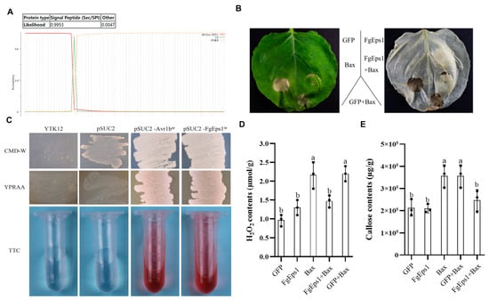 Figure 6. Effect of FgEps1 on H2O2 and callose accumulation in N. benthamiana and analysis of its signal peptide secretion function. (A) Signal peptide prediction of FgEps1 using the Signal Peptide Secretion Prediction Tool is presented. (B) FgEps1 can inhibit Bax-induced cell death in N. benthamiana. (C) The yeast YTK12 strain carrying FgEps1 signal peptide fragment fused in pSUC2 vector was able to grow in CMD-W and YPRAA medium and induce TTC red response. (D) H2O2 content was measured in N. benthamiana leaves collected for 2 days. (E) N. benthamiana leaves collected for 2 days were used to measure callose content. Bars denote standard deviations from three repeated experiments. The same letter on the bars for each treatment represents no significant difference at p < 0.05.