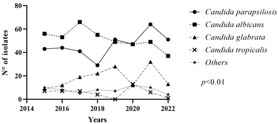 A total of 1039 candidemia episodes were evaluated. The mean and median age of the study population were 68.9 and 73, respectively, and age of study population ranged from 1 to 115 years. The male population totaled 556 (53.46%) and the female population 483 (46.4%). The overall species distribution from 2015 to 2022 showed 412 (39.7%) cases of C. albicans, 371 (35.7%) of C. parapsilosis sensu stricto, 147 (14.1%) of C. glabrata, 45 (4.3%) of C. tropicalis and 64 (6.2%) of others (19 C. krusei, 17 C. guillermondii, 10 C. orthopsilosis, 4 C. dubliniensis, 4 C. metapsilosis, 3 C. lusitanie, 2 C. incospicua, 2 C. pelliculosa, 1 C. famata, 1 C. rugosa, 1 C. lipolytica). The total number of isolates for each Candida species per year is reported in Figure 1. Since the pooled prevalence of C. orthopsilosis and C. metapsilosis among all candidemia episodes was 1.3%, we decided to perform analysis only for C. parapsilosis sensu stricto rather than for the entire complex.