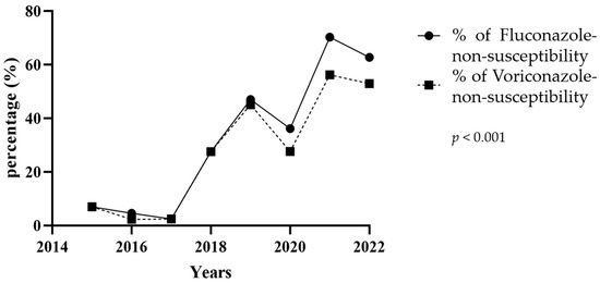 The overall cross-non-susceptibility between fluconazole and voriconazole was 85%. All isolates non-susceptible to voriconazole were also non-susceptible to fluconazole. The score test for the trend of odds (p-trend) showed a statistically significant increase in overall rates of fluconazole- or voriconazole-non-susceptibility in C. parapsilosis sensu stricto over time (p-trend < 0.0001 for both antifungals, Figure 2). A non-parametric Mann–Kendall trend test showed and confirmed this statistically significant increase in prevalence of both fluconazole- and voriconazole-non-susceptibility (p-value < 0.05 for both antifungals) in C. parapsilosis sensu stricto.
