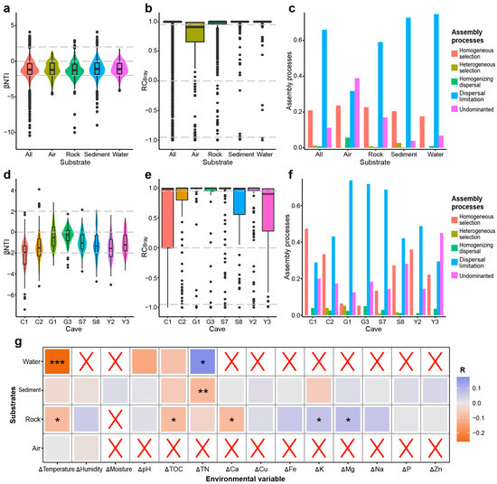 Assembly patterns of fungal communities in Karst caves. (a) β-nearest-taxon index (βNTI) of fungal communities in caves on a large scale. Horizontal dashed lines (βNTI values at 2 and –2): thresholds of significance. (b) Bray–Curtis-based Raup–Crick (RCbray) values of fungal communities in caves on a large scale. Horizontal dashed lines: RCbray value at 0.95 and –0.95. (c) The percentage turnover of community assembly governed primarily by various deterministic processes, including homogenous and heterogeneous selection, and stochastic processes, including dispersal limitations and homogenizing dispersal, as well as “Undominated” processes. (d) βNTI of fungal communities in individual caves. (e) RCbray values of fungal communities in caves on a large scale. (f) The percentage turnover of community assembly governed primarily by various deterministic processes. (g) The relationships between βNTI and changes in the environmental variables. Statistical significance is displayed as follows: * p ≤ 0.05; ** p ≤ 0.01; *** p ≤ 0.001.