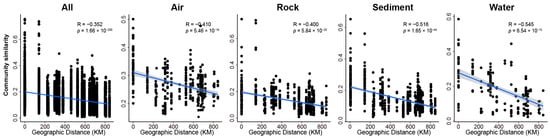βNTI values in air samples did not show a significant correlation with any of the environmental variables. However, βNTI values in rock samples were significantly correlated with changes in temperature, TOC, Ca, K, and Mg. Additionally, βNTI values in sediment samples exhibited significant correlations witwith changes in temperature and TN (Figure 1g). Furthermore, Bray–Curtis similarity values of fungal communities in all, air, rock, sediment, and water samples exhibited significant negative correlations with the geographic distance, indicating a clear distance-decay relationship between them (Figure 2), and providing support for the significant effects of stochastic processes on the assembly of fungal communities in caves.
