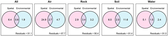 The VPA analysis demonstrated that only 7.0% of the overall fungal community could be explained by spatial variables, and environmental variables explained only 2.5% of the variations. Interestingly, both spatial and environmental variables together accounted for 0.6% of the variations. Consequently, the combined impact of spatial and environmental variables explained a total of 8.9% of the overall variation in the fungal community (Figure 3). Further analyses revealed that the explained variation in fungal community due to spatial and environmental variables was much higher in air samples (32.3%) compared to rock (9.6%), sediment (18.6%), and water samples (9.0%) (Figure 3).
