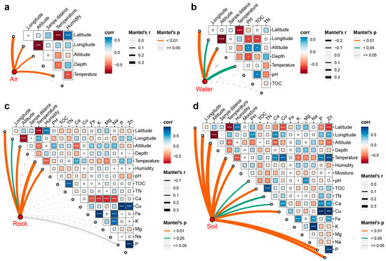 Effects of spatial and environmental variables on fungal community based on Mantel test. (a) Air samples, (b) water samples, (c) soil samples, (d) sediment samples. The red dots on the lower left corner of each panel represent communities in different substrates. The heatmaps on the top right corner show the relationships among spatial and environmental variables, in which, “*” represents correlation significance (* p ≤ 0.05; ** p ≤ 0.01; *** p ≤ 0.001). The lines linking the red dots and right heatmaps represent the effects of variables on fungal communities. The effect of each variable is displayed by the line width, and the significance is displayed by the line color.