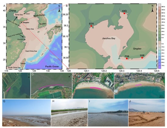 The four sampling locations (A,B) and the meso-tidal beaches sampled in EDG (C,G), EBS (D,H), FSB (E,I), and SSB (F,J). The pink curves in (C–F) mark the areas where sediment samples were collected; EDG and EBS are the estuaries of the Dagu and Baisha rivers, respectively; and FSB and SSB are the First and Shilaoren swimming beaches, respectively.