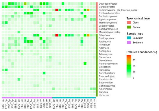 Distinct community compositions were revealed between seawater and sediment. In the intertidal waters, an uncertain class affiliated to the subphylum Pezizomycotina and Agaricomycetes appeared abundant in terms of relative read abundance, as mainly represented by Ciliophora and Amphinema, respectively (Figure 2). In sediments, the class Dothideomycetes, which abundantly consisted of Cladosporium, Alternaria, and Aureobasidium, occurred predominantly at the estuary habitats, i.e., EBS and EDG, in winter, as well as at the beach habitats, i.e., FSB and SSB, in spring. A contrasting trend displayed by the Eurotiomycetes (mainly comprised of Penicillium and Aspergillus) that prevailed at the EBS and EDG in most seasons, except winter, was observed. Moreover, the members of the class Eurotiomycetes were more abundant at the FSB and SSB in summer and winter than in spring and autumn.