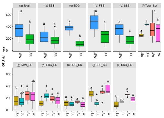The OTU richness across the different substrates (seawater or sediment), seasons, and locations. SW: seawater; SS: sediment; Sp: spring; Su: summer; Au: autumn; and W: winter. EDG and EBS indicate the estuaries of the Dagu and Baisha rivers, respectively; FSB and SSB stand for the First and Shilaoren swimming beaches, respectively. The plots without shared letters indicate the significance at the level of a p value < 0.05.