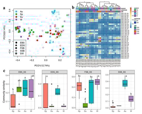 The principal coordinate analysis (PCoA) based on the Hellinger-transformed Bray–Curtis dissimilarity. (a) Comparison of community similarity (1 – Bray–Curtis index) among the different sampling groups (b) and seasons at the individual locations (c) SW: seawater; SS: sediment; Sp: spring; Su: summer; Au: autumn; and W: winter. EDG and EBS indicate the estuaries of the Dagu and Baisha rivers, respectively; FSB and SSB indicate the First and Shilaoren swimming beaches, respectively. The plots without shared letters indicate the significance at the level of a p value < 0.05. The unmarked groups indicate that no significant difference analysis was conducted. For SSB_SS (c), there were not enough summer samples available for a statistical analysis of community similarity.