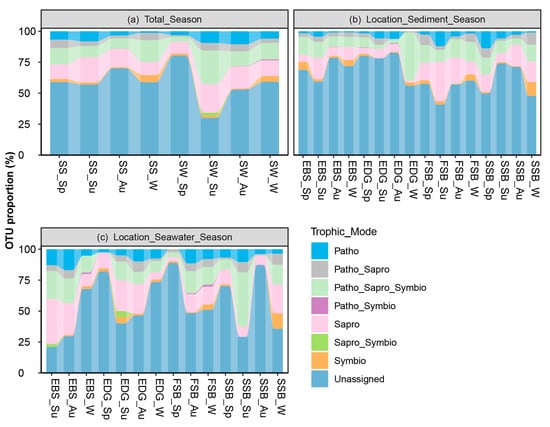 The OTU proportion of trophic modes in the different sampling groups separated by substrate and season (a) and by location, substrate (sediment (b), or seawater (c)) and season. Patho, Sapro, and Symbio are the abbreviations of Pathotroph, Saprotroph, and Symbiotroph, respectively. SW: seawater; SS: sediment; Sp: spring; Su: summer; Au: autumn; and W: winter. EDG and EBS indicate the estuaries of the Dagu and Baisha rivers, respectively; FSB and SSB indicate the First and Shilaoren swimming beaches, respectively.