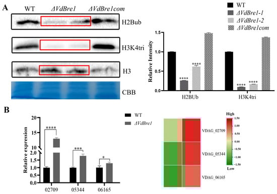 3.6. VdBre1 Governs H2B Ubiquitination and H3K4 Trimethylation