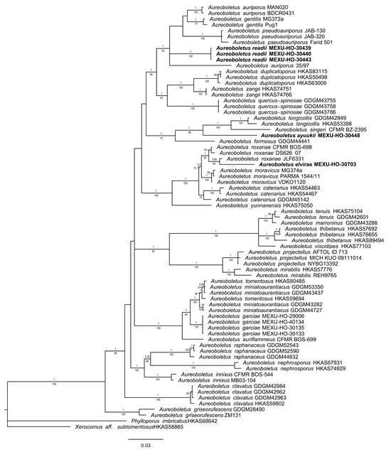 - Zhang, M.; Li, T.-H.; Wang, C.-Q.; Zeng, N.-K. Phylogenetic overview of Aureoboletus (Boletaceae, Boletales), with descriptions of six new species from China. MycoKeys 2019, 61, 111–145. [Google Scholar] [CrossRef]