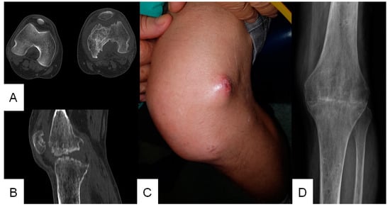 A 66-year-old man presented to INI/FIOCRUZ in June 2015 reporting scratching on his first left finger by a domestic cat diagnosed with sporotrichosis two months before. He progressed with erythema in the left forearm and arthralgia in the right knee. He reported use of amoxicillin and clavulanic acid, initiated after prior medical care at another health unit due to a presumed diagnosis of bacterial infection, but experienced no improvement. There was a medical history of arterial hypertension and type 2 diabetes mellitus, both controlled with medication. Oral itraconazole at a dose of 100 mg/day was initiated. After three months of treatment, he had no cutaneous lesions or arthralgia and was discharged from medical follow-up in September 2015. In July 2017, he returned to INI/FIOCRUZ with a history of left knee pain starting 9–12 months after discharge, which was under investigation with an orthopedist. His family reported daily alcohol consumption and frequent doses of intramuscular and oral dexamethasone to control the knee pain. He had recently undergone a computed tomography scan of the left knee, showing destructive osteoarthritis (Figure 1A,B), and a synovial biopsy with a granulomatous inflammatory infiltrate, from which there was isolation of Sporothrix sp. in culture. Oral itraconazole at a dose of 400 mg/day was then prescribed. Ten months later, with no improvement of the symptoms (Figure 1C), a new arthroscopy was performed with collection of synovial fluid and fragments, which yielded Sporothrix sp. in culture and a chronic granulomatous inflammation with necrosis, hemorrhage, granulation tissue and fibrosis. Additionally, a post-procedure abscess was drained, and the culture tested negative for bacteria. Intravenous amphotericin B lipid complex at a dose of 200 mg twice a week was added to the treatment with itraconazole, with a cumulative dose of 5.2 g over five months. In March 2019, a culture from the synovial fluid remained positive for Sporothrix sp. In August 2019, the patient underwent curettage of the osteoarticular necrotic tissues and arthrodesis when tibia and femur bone fragments also resulted in positive cultures for Sporothrix sp. Histopathological analysis from this site revealed a minimal inflammatory process, with no granulomas or fungi. Oral itraconazole at a dose of 400 mg/day was maintained for one more year and was suspended due to cure. A radiograph of the left knee, performed in August 2020 (Figure 1D), revealed degenerative joint disease and femorotibial ankylosis (the latter was secondary to arthrodesis surgery). The patient remains cured of sporotrichosis after three years of follow-up control.