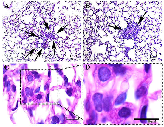 Considering all the abovementioned antecedents and the fact that H. capsulatum affects the lungs as a main target organ, the present study aimed to record the most exciting features in the lung’s cytoarchitecture during the inflammatory response associated with differential histopathological changes generated by the intranasal infection of mice with the M-phase propagules of two different phylogenetic strains of this fungal pathogen.