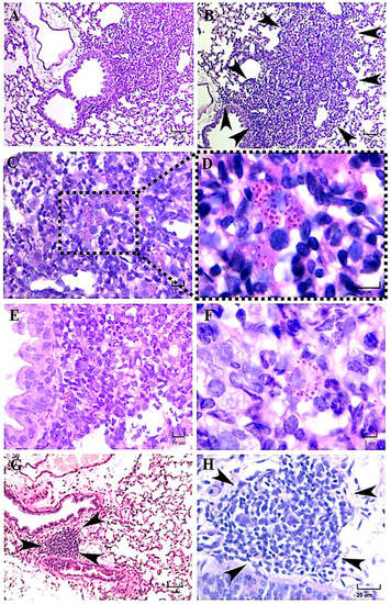 Initially, progressive changes in the pulmonary parenchyma with increased cellularity (macrophages and neutrophils) compatible with pneumonitis were observed in mice infected with both strains at 1 h postinfection. According to our observations,