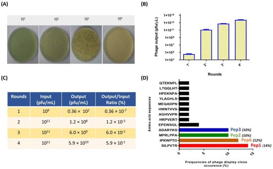 Phage titration was conducted to assess the viral particle output. Both the nonamplified (diluted from 10−1 to 10−4 in LB medium) and amplified eluates (diluted from 10−9 to 10−12 in LB medium) were used to infect an E. coli K12 ER2738 culture. This bacterial culture, previously cultivated as described in Section 2.3, was brought to the mid-log phase at 37 °C with agitation at 250 rpm. The bacterial culture (200 µL) was mixed separately with 10 µL of each eluate dilution, followed by vortexing and incubation at room temperature for 5 min. The resulting suspensions were combined with 3 mL of Top-agar (1% tryptone, 0.5% yeast extract, 0.5% NaCl, and 0.7% bacteriological agar) that had been pre-warmed to 45 °C. After thorough vortexing, the mixture was immediately spread onto prewarmed LB medium plates supplemented with isopro-pyl-beta-D-thiogalactopyranoside/5-bromo-4-chloro-3-indolyl-α-D-galactoside (IPTG/X-gal). Following overnight incubation at 37 °C, the plaques were counted to determine viral particle input and output during the biopanning cycles.