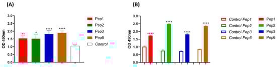 Peptides affinity to P. brasiliensis and PbDrk1 protein determined using ELISA. The figures show the ELISA absorbance values of peptides binding to (A) P. brasiliensis using anti-cell free and (B) PbDrk1 using an anti-Drk1 antibody as primary antibodies, respectively. In Control: peptides were omitted. In Control-Pep1, Control-Pep2, Control-Pep3, and Control-Pep6: PbDrk1 protein was omitted. **** p < 0.0001; ** p = 0.0061, and * p = 0.0158 compared to the respective controls using one-way ANOVA followed by Tukey’s multiple comparisons tests.