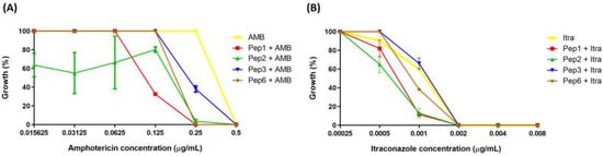 Potentiation effect of selected peptides on antifungal activity. The peptide concentrations were fixed at 200 µg/mL, and antifungal concentrations ranged from (A) 0.015625 to 0.5 µg/mL to amphotericin (AMB) and (B) 0.00025 to 0.008 to itraconazole (Itra). p < 0.0001 for all peptides with 0.25 µg/mL of AMB; p = 0.0001 (to Pep1), p = 0.0138 (to Pep2) and p = 0.0022 (to Pep6) with 0.001 µg/mL of Itra analyzed using two-one way ANOVA with Dunnett’s comparison test.