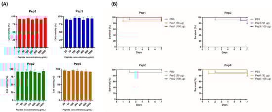 Toxicity of selected peptides for pneumocytes A549 cells and Galleria mellonella. (A) Cytotoxicity in A549 cells determined using the resazurin method. Monolayer cells were treated with increasing concentrations of indicated peptides ranging from 25 to 1.600 µg/mL; after 24 h, metabolic activity was quantified using the resazurin assay, and the absorbance values were normalized to those of the untreated control. The result was expressed as cell viability (%) and analyzed using one-way ANOVA with Tukey’s multiple comparison test. (B) Toxicity in G. mellonella invertebrate model; groups of larvae (n = 10) were injected with 50 and 100 µg/larva of indicated peptides; survival was monitored for 7 days post-injection and analyzed using the log-rank (Mantel–Cox) test. p = 0.9447 (to Pep1), p = 0.4724 (to Pep2), p = 0.3683 (to Pep3), and p = 0.7828 (to Pep6).