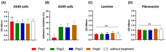 Adhesion inhibition to A549 cells and extracellular matrix mediated by peptides. Paracoccidioides brasiliensis yeast cells were treated for 1 h with 200 µg/mL of each peptide and then used in a monolayer of A549 cells and 96-well coated plate with 10 µg/mL of each laminin and fibronectin for 15 h of incubation and evaluated using ELISA. (A) Absorbance at 490 nm following ELISA for A549 cells, and (B) adhesion inhibition to A549 cells as a percentage for each peptide. (C) ELISA for laminin. (D) ELISA for fibronectin. ns: not significant, * p < 0.05 and ** p < 0.01. p = 0.0156 (to Pep2; 11.2% reduction), p = 0.0178 (to Pep3, 10.9% reduction), p = 0.0063 (to Pep6, 12.9% reduction) compared to the control without treatment. One-way ANOVA followed by Dunnett’s multiple comparison test.