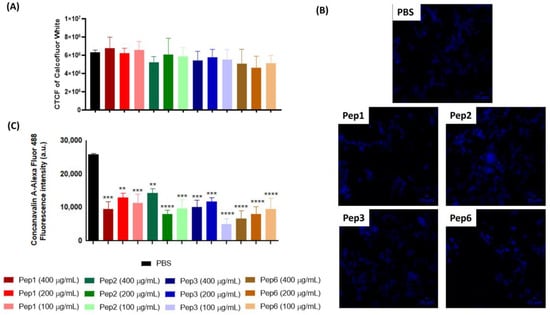 Alterations of cell-wall components of P. brasiliensis after peptide treatment. Yeast cells of P. brasiliensis were treated for 3 h with 100, 200, and 400 µg/mL of each peptide. The cells were labeled with (A,B) calcofluor white (CFW) to measure chitin levels using fluorescence microscopy and (C) concanavalin-Alexa Fluor conjugated to glycosylated proteins levels using cytometry. ** p < 0.01, *** p < 0.001, **** p < 0.0001 compared to the PBS control group using one-way ANOVA followed by Dunnett’s multiple comparisons tests. CTCF: corrected total cell fluorescence. Scale bars are included = 10 µM.