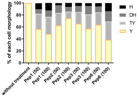 Morphological transition in P. brasiliensis after peptide treatment. The mycelium phase of P. brasiliensis was treated with different concentrations (50 and 100 µg/mL) of each peptide and incubated at 37 °C until the control (without treatment) reached complete conversion to the yeast phase (9 days). Aliquots of each group were analyzed using optical microscopy to discriminate the cell morphology as described by Nunes et al. [38]; H: hyphae, DH: differentiate hyphae, TY: transforming yeasts, and Y: yeasts.