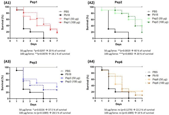 Use of peptides to protect G. mellonella larvae against P. brasiliensis infection. The survival curve of G. mellonella larvae (n = 10 per group) was treated with the selected peptides (A1) to Pep1, (A2) to Pep2, (A3) to Pep3 and (A4) to Pep6 at both concentrations (50 and 100 µg/larva) 3 h before infection with P. brasiliensis. Statistical analyses were performed using the log-rank (Mantel–Cox) test of three independent experiments. * p < 0.05, ** p < 0.01, *** p < 0.001 and ns: not significant. The p values for each peptide and concentration as well as the % of larvae survival are described in the figure.