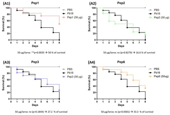 Use of peptides to combat G. mellonella infection with P. brasiliensis. Survival curve of G. mellonella larvae (n = 10 per group) infected with P. brasiliensis and treated with the selected peptides (A1) to Pep1, (A2) to Pep2, (A3) to Pep3 and (A4) to Pep6 at 50 µg/larva for 3 h. Statistical analyses were performed using the log-rank (Mantel–Cox) test of three independent experiments. ** p < 0.01, and ns: not significant. The p values for each peptide and concentration as well as the % of larvae survival are described in the figure.