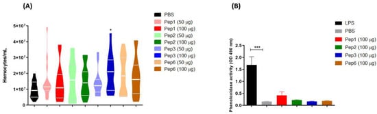 The phenoloxidase activity after peptide treatment at 100 µg/larvae for 3 h was also evaluated as described by Scorzoni et al. [34]. The hemolymph was removed from five larvae and pooled in cold anticoagulant solution (50 µL hemolymph pool: 150 µL anticoagulant solution). The cells were separated by centrifugation at 27× g 5 min, and 50 µL of cell-free hemolymph samples was added to a 96-well microtiter plate containing 50 µL of PBS. As a positive control, 50 µL of 2.5 mg/mL of lipopolysaccharide was added rather than adding PBS; the plate was incubated at 25 °C for 5 min, and the substrate, 25 µL of 6 mM L-DOPA (Sigma), was added and incubated again for 1 h at 25 °C. Absorbance was measured at 490 nm.