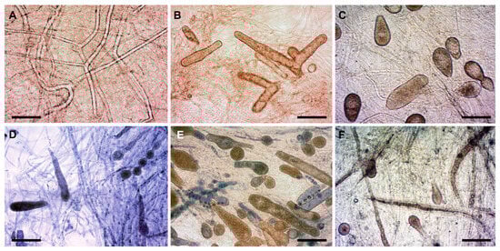 Morphological variability of S. parasitica (isolate SAP134) under various in vitro conditions. (A) SDW at RT (hyphae only); (B) SDW + HS at RT (zoosporangia and gemmae); (C) SDW + FS at RT (zoosporangia and gemmae); (D) STW + HS at RT (zoosporangia with or without primary cysts inside, gemma, and gemma chain); (E) STW + FS at RT (gemma and zoosporangia with or without primary cysts inside); (F) STW + FS at fridge temperature (+6–7 °C) (zoosporangia). Scale bar: 100 µm. Native squash preparations (except for (D,E), squash preparations stained with 1% aqueous methylene blue). SDW: sterile distilled water; STW: sterile, de-chlorinated tap water; HS: hemp seed; FS: fish skin extract; RT: room temperature (+20–21 °C).