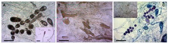 Morphological differences among the three morphotypes of S. parasitica (conditions: STW + FS at RT). (A) Long gemma chains in Morphotype 1 (SAP194); A inset: zoosporangium and cysts; (B) gemmae, zoosporangia, zoospores, and cysts in Morphotype 2 (SAP203T); (C) primary cysts in a zoosporangium in Morphotype 3 (SAP134); C inset: numerous zoospores and cysts produced after cold induction (SAP200B). Scale bar: 100 µm. Native squash preparations (except for (C), squash preparations stained with 1% aqueous methylene blue).