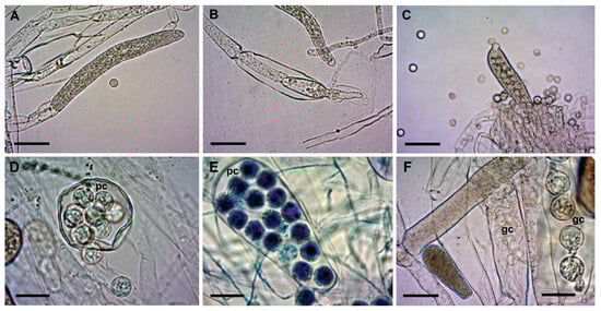 Figure 3. Zoosporangia of S. parasitica at different stages of development. (A) Primary, immature zoosporangium and a cyst (SAP194); (B) secondary zoosporangium (SAP191); (C) mature zoosporangium with numerous zoospores and cysts around (SAP191); (D) spherical zoosporangium; (E) clavate zoosporangium with filiform appendix in the last stage of zoospore release (SAP200B); (F and F inset): cysts germinating in zoosporangia (SAP200B). Scale bars: 50 µm (A–C,F) or 20 µm (D–F inset). pc: primary cysts; gc: germinating cysts. Squash preparations, native (A–D,F and F inset) or stained with 1% aqueous methylene blue (E).