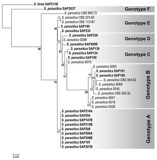 The molecular species identification was based on an ITS DNA sequence similarity search using NCBI Megablast. A concatenated alignment was created using consensus RPB2 and SHMT DNA sequences (and relevant S. parasitica sequences from NCBI Genbank) obtained with the MAFFT alignment tool in Geneious Prime v2019.2.1 (Dataset S1 and Table S3). The best evolutionary model was predicted using ModelTest-NG v0.1.5 and was shown to be GTR + I + G4 for RPB2 and GTR + I for SHMT. The tree inference was conducted using RAxML-NG v1.1.0. The robustness of the tree was determined with a non-parametric, transfer bootstrap expectation (TBE) calculation using 1000 repeats. S. ferax isolate SAP213B was chosen as an outgroup. The phylogenetic tree was visualized using MEGA 7 and edited using Inkscape v1.3. The threshold bootstrap value for distinguishing genotypes was 75%. In addition, the genotype-related pattern of single-nucleotide polymorphisms (SNPs) was determined.
