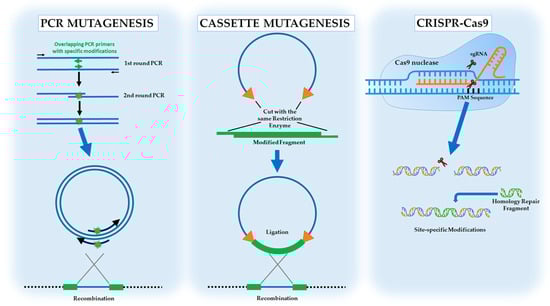 Overview of the key genetic techniques used in metabolic engineering applications, to introduce specific and targeted changes. Using PCR mutagenesis; insertion, deletion or point mutations can be generated. Cassette mutagenesis uses specific restriction sites and modified fragments can be introduced into vectors for further recombination to host organisms. CRISPR-Cas9 is a state-of-the-art genome editing technology in which the modifications can be targeted in a fast and precise fashion.